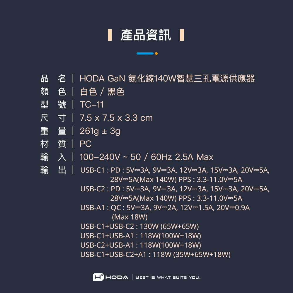 140W GaN氮化鎵智慧方型三孔電源供應器 / 極速智能充電器 (內附240W C to C 充電線)| HODA®