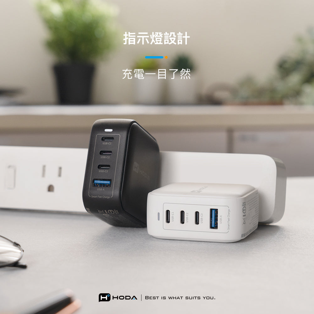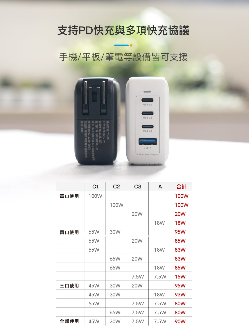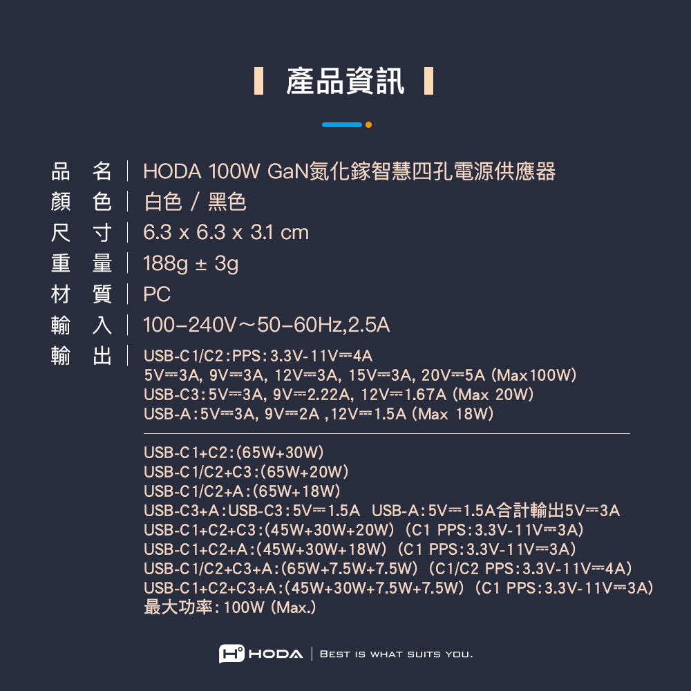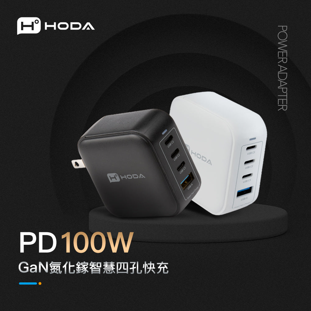 100W GaN氮化鎵智慧方型四孔電源供應器 / 極速智能充電器 (內附100W C to C充電線)| HODA®