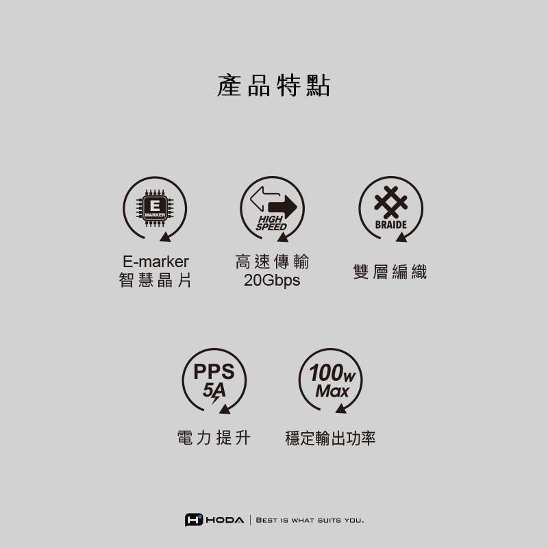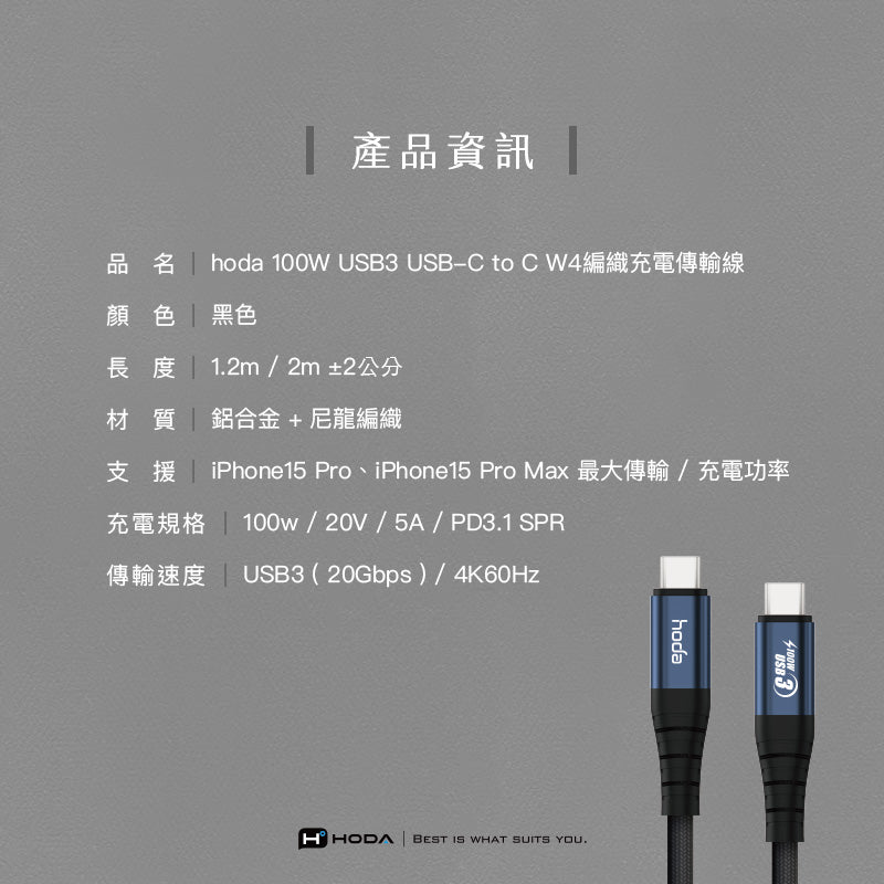 100W 5A USB3【USB-C to C】120cm / 200cm 快速充電編織線材 | HODA®