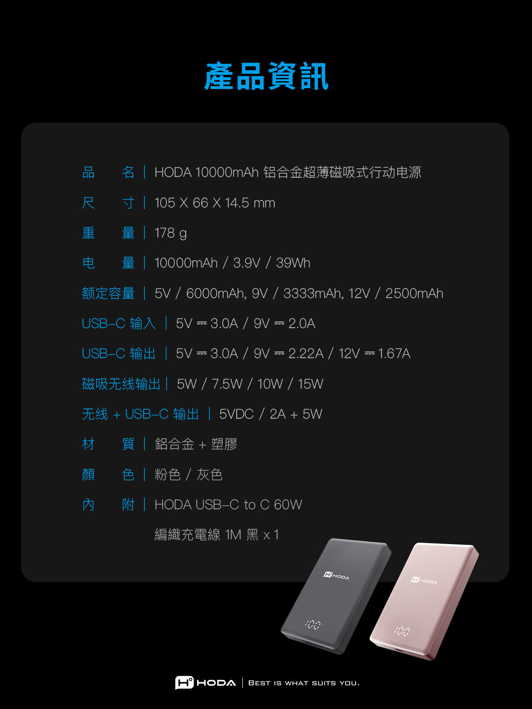 10000mAh 磁吸式鋁合金超薄行動電源 | HODA®