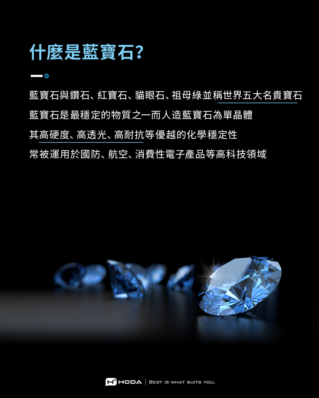 藍寶石是全世界最穩定的物質之一,而人造藍寶石因單晶體,化學穩定性更強並具有一流的強度、耐抗性及極良好的透光性。