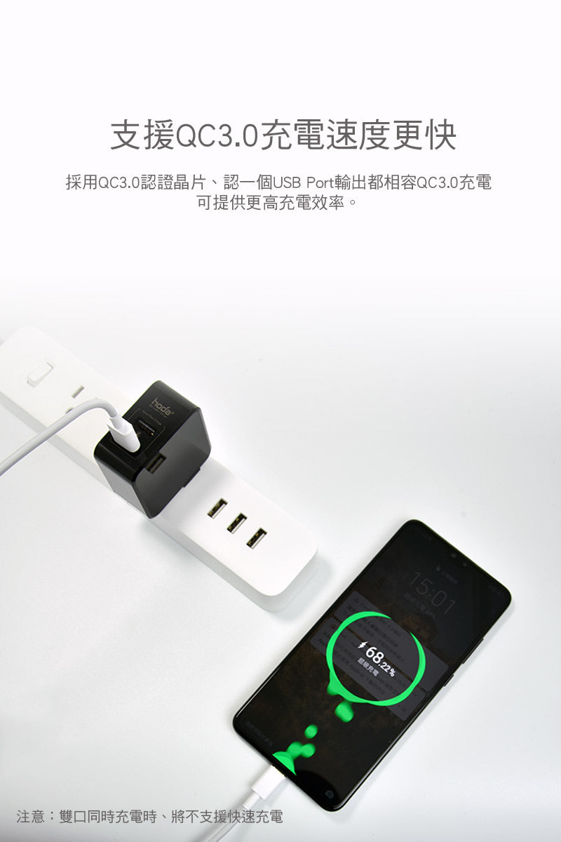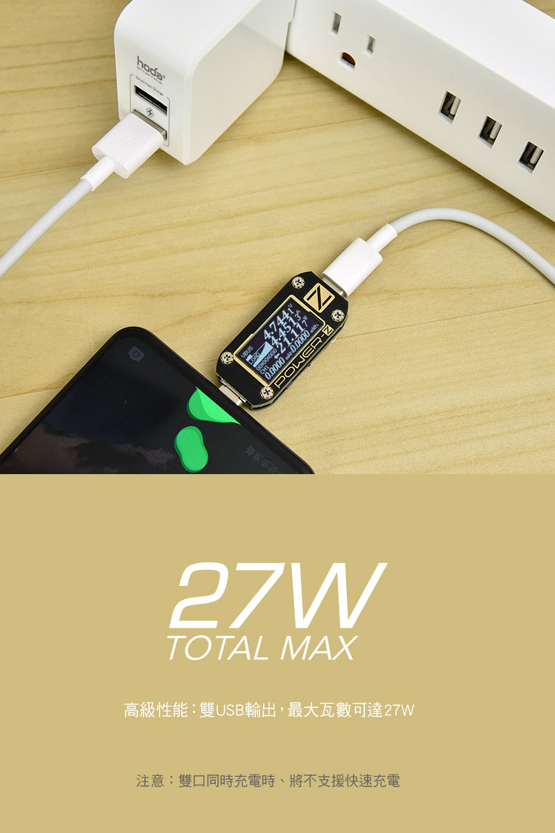 雙USB輸出,最大瓦數可達27W,輸入為100-240V