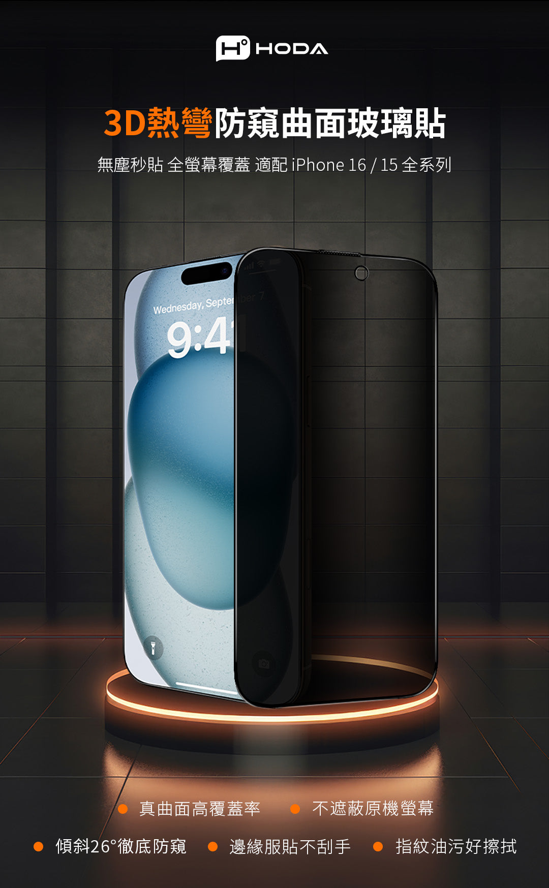 3D熱彎曲面 防窺玻璃保護貼 iPhone 17 / Air / 16 / 15 系列 附無塵滾輪太空艙貼膜神器 | HODA®