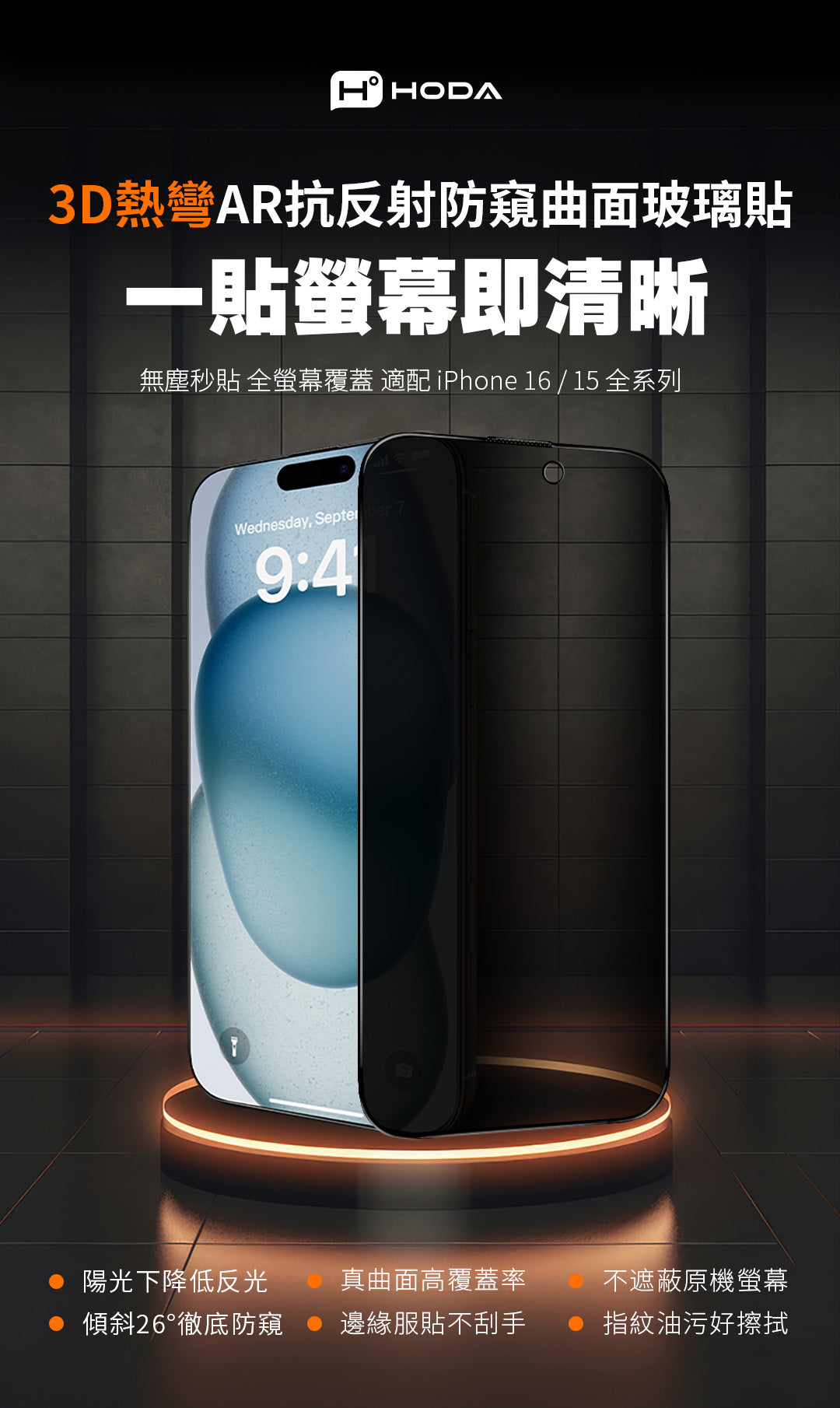 3D熱彎曲面 AR抗反射防窺玻璃保護貼 iPhone 17 / Air / 16 / 15 系列 附無塵滾輪太空艙貼膜神器 | HODA®