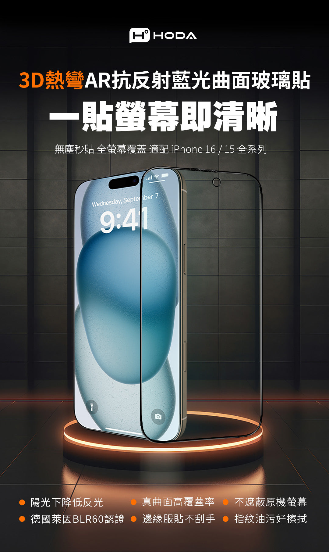 3D熱彎曲面 AR抗反射抗藍光玻璃保護貼 iPhone 17 / Air / 16 / 15 系列 附無塵滾輪太空艙貼膜神器 (德國萊因TÜV BLR60認證) | HODA®