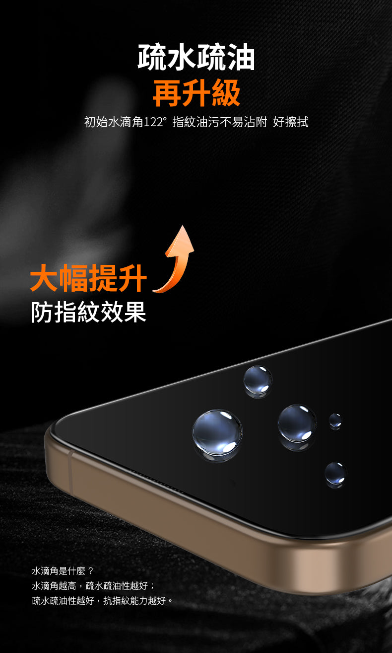 ✦ 獨家長效抗污配方,初始水滴角高達122°,手感滑順且不易沾附指紋