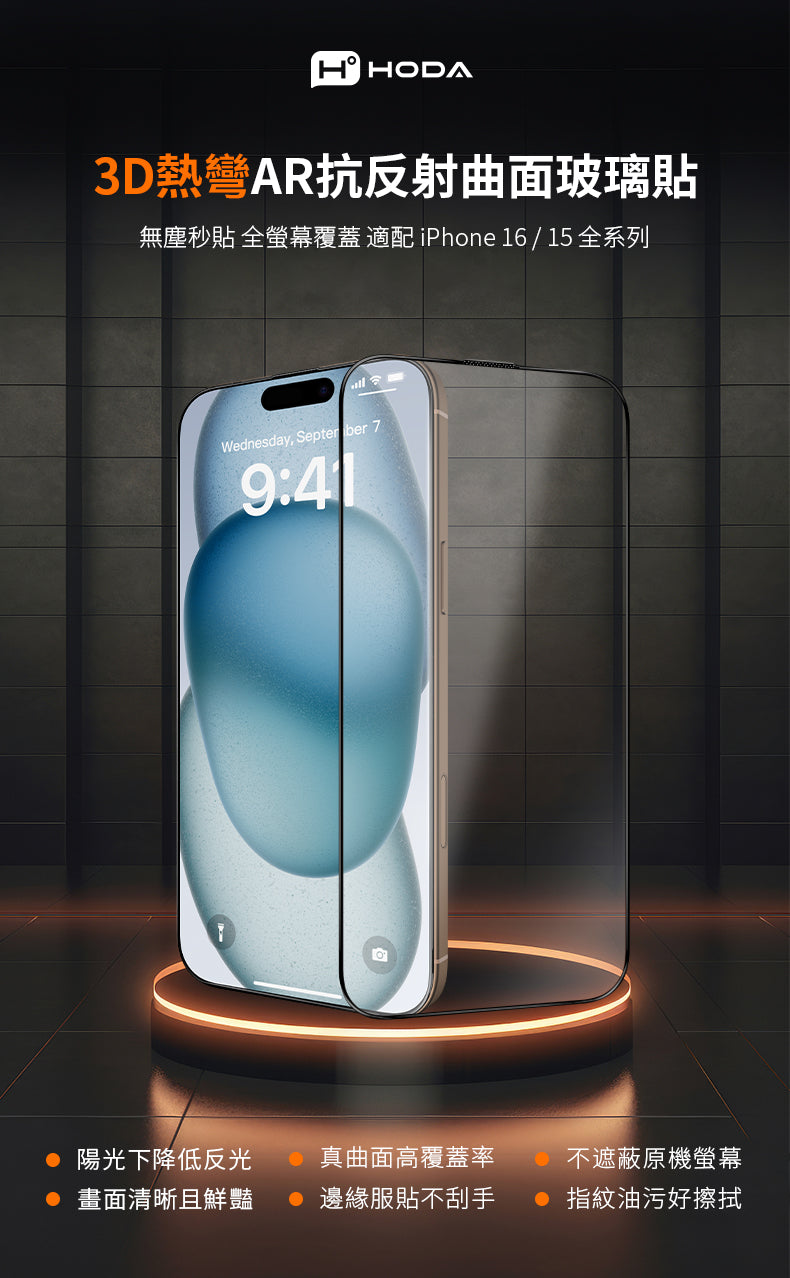 3D熱彎曲面 AR抗反射玻璃保護貼 iPhone 17 / Air / 16 / 15 系列 附無塵滾輪太空艙貼膜神器 | HODA®